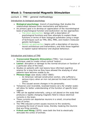 High-quality comprehensive subject notes created from all lectures. Important tables, external research and definitions have also been integrated to enhance an overall understanding of course material. Topics covered: Week 1: Transcranial Magnetic Stimulation Week 2: Statistical Hypothesis Testing Week 3: Electroencephalography Week 4: Functional Magnetic Resonance Imaging Week 5: Research Applications of fMRI Week 6: Anatomy & Neurobiology of Memory Week 7: Theories of Memory & Disorders Week 8: Neuropharmacology Week 9: Dopamine & Noradrenaline Week 10: Serotonin & Non-Traditional NTs Week 11: Neurogenetics & GWAS Week 12: Neurogenetics & Animal Models