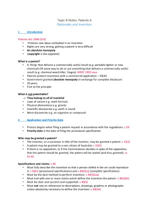 I achieved HDs for my IP assignment and exam using these notes. They comprise a comprehensive yet concise incorporation of ALL readings, including: - The textbook - Cases - Study guides - Lecture materials They are very thorough and easy to read so you won't need to read the textbook, cases or study guides, which will save a lot of time. They include the following topics: 1. Introduction to IP 2. Trade Marks A: Registrability 3. Trade Marks B: Ownership, Opposition, Rights and Infringement 4. Trade Marks C: Defences and Counterclaims 5. Copyright A: Protection and Ownership 6. Copyright B: Rights and Infringement 7. Copyright C: Defences and remedies 8. Patents A: Rationales and Invention 9. Patents B: Validity 10. Patents C: Rights and Infringement