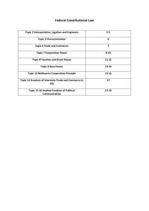 Essay Exam Notes for FedCon final * All essay topics are included; * An essay template is provided; * Clear structure and all authorities you need to back up your arguments Topics: - Interpretation, Legalism and Engineers - Characterisation - Trade and Commerce - Corporation Power - Taxation and Grant Power - Race Power - Melbourne Corporation Principle -Freedom of Interstate Trade and Commerce (s 92) - Implied Freedom of Political Communication