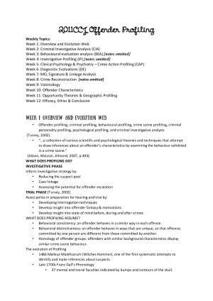 I thoroughly enjoyed this subject, and it taught me so much in terms of profiling skills and how they could be applied in day to day policing. I have removed some notes as they contain too many examples and for legal reasons they can not be shared. I hope the rest of these notes can help you excel in this subject as they helped me! Week 1: Overview and Evolution Web Week 2: Criminal Investigative Analysis (CIA) Week 3: Behavioural evaluation analysis (BEA) [notes omitted] Week 4: Investigative Profiling (IP) [notes omitted] Week 5: Clinical Psychology & Psychiatry – Crime Action Profiling (CAP) Week 6: Diagnostic Evaluations (DE) Week 7: MO, Signature & Linkage Analysis Week 8: Crime Reconstruction [notes omitted] Week 9: Victimology Week 10: Offender Characteristics Week 11: Opportunity Theories & Geographic Profiling Week 12: Efficacy, Ethics & Conclusion