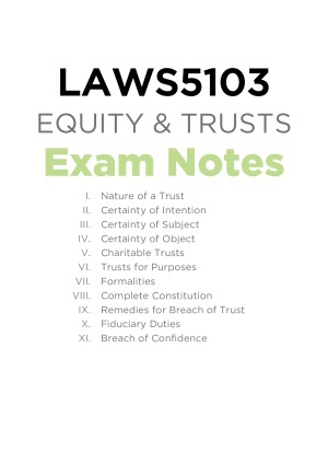 Detailed exam notes for Trusts. Structured to answer problem questions and essays. Covers the content from lectures and tutorials, and includes case summaries and relevant statutory provisions. Print ready. Topics covered: 1. Nature of a Trust 2. Certainty of Intention 3. Certainty of Subject 4. Certainty of Object 5. Charitable Trusts 6. Trusts for Purposes 7. Formalities 8. Complete Constitution 9. Remedies for Breach of Trust 10. Fiduciary Duties 11. Breach of Confidence NOTE: This only includes notes for the trusts part of the course, not equity.