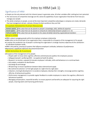 This doc has been compiled from the lectures, tutorials, and the textbook. I scored a 7 for the final exam and my revision is based on this revision sheet. This doc contains the all content needed for a 7. Content covered: Introduction to HRM (week 1) Approaches to HRM (week 2) Environment of HRM (week 3) HR Planning & Job analysis (week 5) Recruitment and Selection (week 6) Performance Management (week 8) HR Training and Development (week 9) Rewards Management (week 10) Managing workforce diversity (week 11) Evaluating HRM (week 12) This document is coloured with important sections highlighted. Good luck!