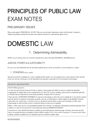 Topics covered include: - The conception of public law and the state - The state and territorial acquisition - The state and people - The state and extraterritoriality - The acquisition of independent statehood in Australia - Australian public law: Constitutions, legislation, and the common law - Organisation of public power within states - Sources of Public international law: custom, treaties and other sources - United Nations: organisation of public power among states - Treaties - Rule of law - Structure of the legislature - Delegated Legislation - Structure of the executive (incl immunity) - Executive power - Independence of the judiciary - Judicial power, jurisdiction and justiciability - Public law litigation - International human rights - Protection of rights in Australia - Relationship between international law and domestic public law Includes reading summaries, lecture notes (weeks 1 - 12), case summaries