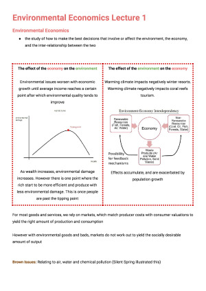 Lecturer: Rebecca Taylor Super comprehensive notes, with all diagrams necessary. Everything I needed to secure a high HD in this subject - good as a guide to use alongside the lectures, or as a last minute cram resource! I really loved this course so hopefully that translates through these notes. *NOTE: Practice questions included, answers shaded out in black (copy and paste blacked out answers into word document to view answers) Topics included: • Introduction to environmental economics • Market Failure • Demand for Environmental Goods • Regulation and Cost-Benefit Analysis • Valuing Environmental Resources • Optimal Regulation & Property Rights • Tradable Permits; Uncertainty and Irreversibility • Climate Change • Energy Efficiency • Trade, development, and the environment