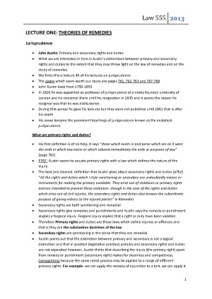 The whole semesters lecture notes needed for exams Contains: Lecture One: Theories Of Remedies Lecture Two: Pre-Trial Trial Resolution/ Alternative Dispute Resolution Lecture Three & Four: Torts: Damages For Personal Injury, Defamation, Property And Economic Loss Lecture Five: Damages For Breach Of Contract; Actions For Contractual Fixed Sum; & Rescission Lecture Six: Restorative Justice- Focus: Youth Justice Conferencing Scheme Lecture Seven: Specific Performance And Injunctions Lecture Eight: Equitable Compensation And Damages; Mareva And Anton Piller Orders And Declerations Lecture Nine: Restitution For Unjust Enrichment And Wrongs Lecture Ten: Constructive Trusts Lecture Eleven: Constitutional Remedies Lecture Twelve: Administrative Law Remedies
