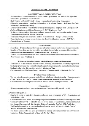 Comprehensive notes on all examinable topics. Includes Separation of Powers, Federalism, External Affairs, Corporations and more.