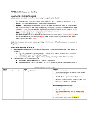 These notes incl. material from lectures; tutorials; textbook and case material/legislative provisions. They are extremely comprehensive and very helpful for closed-book exam prep and in completing the assignment (for which I received 45/50). Topics include: Introduction Judicial Review and Standing Grounds of Judicial Review - Intro and Procedural Fairness - Determining the Scope of Power - Improper Exercise of Power; Fraud and No Evidence Consequences of Unlawful Action Limits on Judicial Review Merits Review and Admin Tribunals Ombudsmen and Information Disclosure