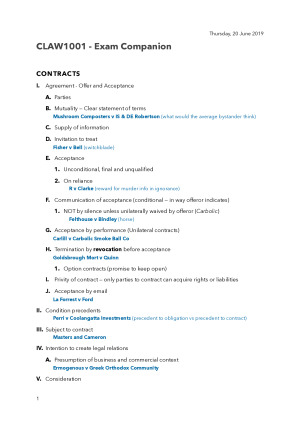 Extremely detailed and well-structured course notes for CLAW1001 for an in-depth understanding of business law principles. Includes an exam companion sheet for easy and quick reference during exams with case precedents clearly highlighted for key principles. Relevant legislation and case precedents for all core principles are clearly indicated throughout the notes in a distinct colour for ease of reference. This is highly useful for assignment research and exam preparation and performance. These notes are highly suitable for the open book final exam. Course notes have been compiled from the textbook (Terry and Giugni, Business and the Law), lecturer’s content and comments, tutorials and individual case research. Covers the following topics in depth: 1. The Australian Legal System 2. Parliament and Legislation 3. Statutory interpretation and Common Law Principles 4. Contracts I – Offer, Acceptance and Agreement 5. Contracts II – Intention, Consideration, Estoppel, Capacity, Legality, Misrepresentation, Mistake, Duress, Undue Influence 6. Contracts III – Express and Implied Terms, Exclusion Clauses, Privity, Novation, Termination, Frustration, Common Law and Equitable Remedies 6. Contracts IV – Specific Issues, Electronic Communication, Estoppel, Good Faith Caluses 7. Torts I – Negligence (Duty of Care, Precedents, Salient Features, Standard of Care) and Other Specific Torts 8. Torts II – Causation, Remoteness of Liability, Vicarious Liability 9. Australian Consumer Law – Consumer Guarantees, Strict Liability for Safety Defects 10. Australian Consumer Law – Misleading or Deceptive Conduct, Tort of Passing Off, Unconscionable Conduct, Unfair Contract Terms 11. Competition and Consumer Act – Anti-competitive Agreements, Cartel Conduct, Price Fixing, Misuse of Market Power, Exclusive Dealing, RPM