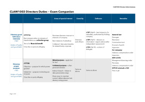Extremely detailed and well-structured course notes for CLAW1003 to promote an in-depth understanding of principles of corporate law. Includes an exam companion sheet for easy and quick reference during exams for directors duties with legislation references clearly highlighted. Relevant legislation and case precedents for all core principles are clearly indicated throughout the notes in a distinct colour for ease of reference. This is highly useful for assignment research and exam preparation and performance. These notes are highly suitable for the open book mid-semester and final exam. Course notes have been compiled from the textbook, lecturer’s content and comments, tutorials and individual case research. Covers the following topics in depth: 1. Corporate Structure – Separate Legal Entity, Limited Liability 2. Incorporation and the Corporate Veil, Types of Companies, Related Body Corporate 3. Promoters Obligations, Pre-Incorporation Contracts, Ratification, Board Authority and Types of Directors, Disqualification of Directors 4. Law of Agency and Ostensible Authority, Third Party Assumptions of Regularity, Replaceable Rules, Abolition of Constructive Notice, Pre-emptive Share Rights, Directors’ Employment Contracts 5. Membership, Share Issue and Transfer, Disclosure and Prospectus 6. Insider Trading and Securities Markets 6. Directors’ Duties – Good Faith and Proper Purpose 7. Directors’ Duties – Conflicts of Interest, Fiduciary Duty of Loyalty and Good Faith, Improper Use of Position and Information, Material Personal Interests 8. Ratification 9. Insolvency, Directors’ Duties and Insolvent Trading 10. Statutory Derivative Action, Oppression