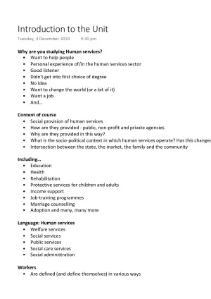 Includes all 9 lectures 1. Introduction to the unit 2. Welfare in Australia 3. Values 4. Politics and Services Provisions 5. Tensions & Dilemmas 6. Fields of Practice 7. Frameworks for Human Service Provision 8. Poverty and Inequality - Receiving Human Services: Impact and Approaches 9. Difference & Diversity: Anti-oppressive practice