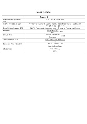 List of formulas needed for this course. Course taken in 2017 so content may have changed Topics Included: - Aggregate Production and Prices - Employment, Unemployment and the Labour Market - Interest Rates, Investment and Savings - Income-Expenditure Model of GDP - Government Sector and Fiscal Policy - Finance Assets, Money and Private Banks - Central Banks and Monetary Policy