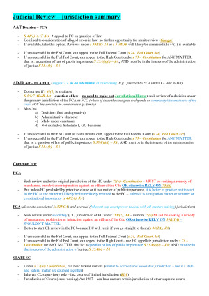 Comprehensive problem question notes for admin law. Everything is logically broken up into steps for easy reference in the exam. Brief case summaries of all cases covered in the course + their relevance to each element. These notes helped me achieve a high distinction in this subject. Topics include: - Freedom of information - Merits review - Judicial review: jurisdiction summary - Judicial review: ADJR Act and common law elements - Grounds for judicial review (ADJR and common law avenues) - Remedies
