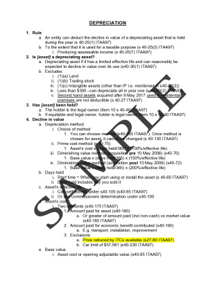These are the notes I used in the exam. They are set up to enable quick and efficient exam answers that cover all the issues. Tax law is one of those subjects where if you have good notes you get a good mark - don't waste time studying needlessly. TOPICS COVERED: 1. GST 2. ITCs, Adjustments, and GST Accounting 3. Ordinary Income 4. General Deductions 5. Provisions that Deny or Limit Deductions 6. Depreciation 7. Trading Stock 8. Capital Gains Tax 9. Companies and Shareholders 10. Superannuation 11. Total Tax Liability Calculation