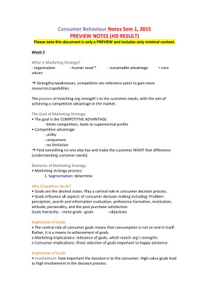 This is my compilation of EVERYTHING Consumer Behaviour for MARK2051. I achieved a 90 in this subject using these resources, and by resources I mean every single resource you could need for this course. Including: - Fully summarised course content from lectures, tutorials AND the textbook - Sample exam questions ALL answered - ALL CB articles and resources summarised - HUGE Question Pool for Online Quizzes and most importantly... --> CB Model: Essay AND complete diagram! This is everything you need to ace this course!!!