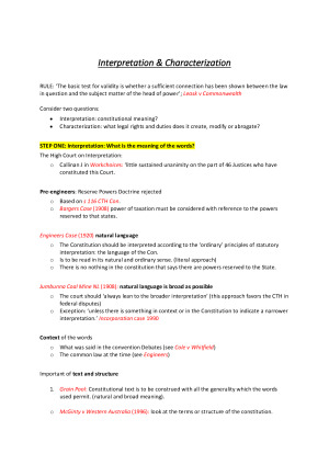 These notes are a combination of prescribed readings, lecture notes, seminar discussions and material and additional research. All sources of law are in red for easy reference. These notes include step-by-step instructions to assist with approaching and answering exam questions in a comprehensive manner. I achieved a HD in the exam with these notes alone. *TOPICS* Interpretation & Characterisation Grants Power Corporations Power External Affairs The Executive Inconsistency and Intergovernmental Constitutional Rights and Freedoms Implied Freedoms Separation of Judicial Powers