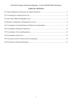 These distinction cheat sheets summarise the ENTIRE ACCT2452 term course content in a very concise manner. These notes are IDEAL for studying for the midterm and final exam as they contain ALL of the relevant theory from the prescribed readings and lecture slides in addition to clear, step-by-step TEMPLATES (with all necessary journal entries) for solving challenging calculation questions which are frequently assessed in exams. Where relevant, these notes also include coloured diagrams, tables, flowcharts and other helpful visual representations to aid the reader's ability to understand and memorise course concepts in this very content and calculation heavy subject. As ACCT2542 is considered by many to be one of the most challenging subjects in the UNSW accounting major, these notes are a MUST HAVE for students wishing to improve their final results. Content included: Topic 1: Nature, Regulation And Financing Of Company Operations Topic 2: Accounting For Company Income Tax Topic 3: Fair Value, PP&E And Intangible Assets Topic 4: Business Combinations and Impairment Topic 5: Consolidation: Wholly Owned Subsidiaries Topic 6: Consolidation: Intra-group Transactions Topic 7: Consolidation: Non-Controlling Interest Topic 8: Consolidation: Other Issues Topic 9: Associates & Joint Arrangements Topic 10: Translation Of Financial Statements