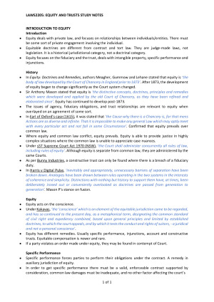 Notes from lectures, tutorials, and readings from weeks 1-12 of the course. TOPIC LIST: Introduction to Equity Fiduciary Obligations Status Based Relationships Indicia of Ad Hoc Relationships Scope of Relationship and Breaches Defences to Breach of Fiduciary Duty Assignments in Equity Introduction to Trusts Creation of Express Trusts Certainty of Intention Certainty of Subject Matter Complete Constitution Certainty of Objects Express Trusts Administration of Express Trusts Trustees Powers Trustees Duties Trustees Standard of Care Termination of Trusts Remedies for Breach of Trust and Fiduciary Duty Loss Related Equitable Consumption Gain-Based Remedies Proprietary Remedies Tracing Third Party Liability Resulting Trusts Constructive Trusts