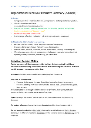 Definitions (topic based): 5 pages Executive Summary: 2 pages (study guide) Summaries: pages 8-29 - Organisational behaviour - Attitudes - Self-leadership, reflection and learning - Individual decision making - Foundation of group behaviour - Trust and team building - Politics and power - Organisational structure - Organisational culture - Organisational change - Managing diversity Summary week notes with essay advice