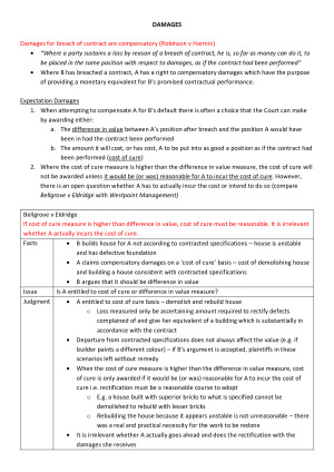 Comprehensive exam notes for LAWS1075 that cover all topics assessed in the exam: - Damages - Limitations for damages - Limits on agreed remedies and penalties doctrine - Action for debt - Rescission - Specific performance - Vitiating factors: mistake, misrepresentation, misleading/deceptive conduct, undue influence, duress, unconscionable dealing