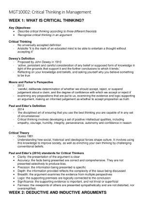 These notes cover all topics covered throughout the semester in an in-depth yet easy to understand manner. Using these notes to study for exam enabled me to achieve a High Distinction (HD). Week 1: What is Critical Thinking? Week 2: Deductive and Inductive Arguments Week 3: Sense-Making Week 4: Evidence-Based Management (EBM) Week 5: Multiple Perspectives Week 6: Ethics - An Introduction to Ethical Frameworks Week 7: Ethics - Corporate Social Responsibility Week 8: How to not Critically Think Week 9: Managing Complexity Week 10: Critical Thinking and Creativity Week 11: Reflective Practice Week 12: Learning is and beyond the Workplace