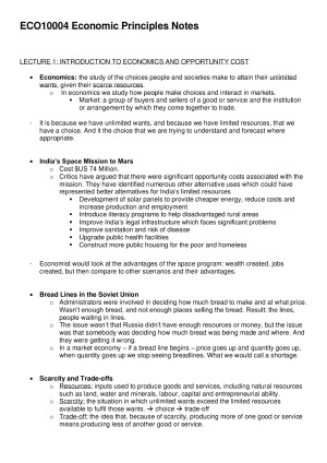 These notes cover all topics covered throughout the semester in an in-depth yet easy to understand manner. I had not previously studied economics and found the unit quite difficult, however the notes I collated throughout the semester really helped me in achieving a HD (high distinction). TOPICS - Week 1: Introduction to Economics and Opportunity Cost - Week 2: Market Forces - Week 3: Elasticity - Week 4: Costs of Production - Week 5: Market Power - Week 6: Opilogopoly and Externalities (Pollution) - Week 7: GDP and Economic Growth - Week 8: Unemployment and Inflation - Week 9: Aggregate Demand and Supply - Week 10: Monetary Policy - Week 11: Fiscal Policy - Week 12: REVISION
