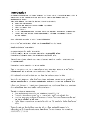 Covers week 1-12, all content and readings. Topics: - Review of statistical concepts - Linear regression - Multiple regression - Persistence in time series - Large sample properties of the OLS estimator