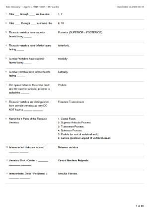 ANAT3007 is a content-driven, extremely loaded subject with a giant content base. I spent many hours curating this deck from every single sentence of the ANAT3007 book - resulting in 1100+ cards. I CAN GUARANTEE A MARK OF 85 AND ABOVE IF YOU DO THIS DECK EVERY WEEK BEFORE CLASSES. This subject can be very difficult - but if you are diligent and use these flashcards, you will succeed, and save you 30+ hours in the process. These notes can be used either as is, or converted into an Anki deck/quizlet if need be through extensions. WEEK 1: THORACIC WALLS + ANTEROLATERAL ABDOMINAL WALLS. WEEK 2: POSTERIOR BODY WALLS + INTERNAL TRUNK DIVISIONS + HEART AND PERICARDIUM. WEEK 3: ARTERIES OF THE TRUNK + VEINS OF THE TRUNK. WEEK 4: LYMPHATIC SYSTEM AND BREAST + RESPIRATORY SYSTEM AND PLEURA. WEEK 5: ALIMENTARY 1 + ALIMENTARY 2. WEEK 6: ALIMENTARY 3 + ALIMENTARY 4. WEEK 7: ALIMENTARY 5 + PELVIS AND PERINEUM 1. WEEK 8: PELVIS AND PERINEUM 2 + PELVIS AND PERINEUM 3. WEEK 9: URINARY 1 + URINARY 2. WEEK 10: REPRODUCTIVE SYSTEM - MALE 1 + REPRODUCTIVE SYSTEM - MALE 2. WEEK 11: REPRODUCTIVE SYSTEM - MALE 3/FEMALE 1 + REPRODUCTIVE SYSTEM - FEMALE 2. WEEK 12: REPRODUCTIVE SYSTEM - FEMALE 3 + AUTONOMIC NERVOUS SYSTEM 1. WEEK 13: AUTONOMIC NERVOUS SYSTEM 2 + AUTONOMIC NERVOUS SYSTEM 3. Good luck!