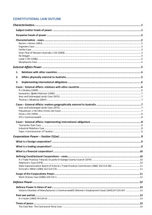 A summary of all subjects covered from week 1-12 including case summaries. Organised by TOC for exam. Characterisation External Affairs Power Corporations Power – Section 51(xx) Defence Power Vertical Fiscal Imbalance Freedom of interstate trade Separation of Judicial Powers The Executive & Parliament Voting for Parliament Express Rights and Freedoms Implied Freedoms