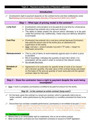 Very structured exam notes with short case summaries embedded. Very useful for a problem based exam as key arguments and principles are included and references are to made to the AS4000 clauses. Both me and my friend worked on these notes together and used them in our exam* (our scores were 86 and 87). Note: the exam is based on the AS4000 contract but due to the amount of different guest lecturers in the course teaching different contracts, AS4000 was hardly taught in class. Hopefully the notes are sufficient in covering all the relevant AS4000 clauses (and save you the trouble and self-learning like we did) All topics in the course are covered: - Risk allocation and delivery models - Extensions of time - Quality of work - Costs - Variations - Regulation of the construction industry - Latent conditions - Superintendents - Subcontracts - Securities - Insurance - Duty of care / proportionate liability - Building information modelling *My friend has agreed to the sale of these notes and all profits will be shared.