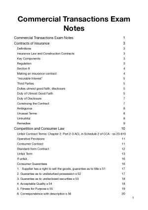 These notes include all topics covered in the 2018 Commercial Transactions course, such as contracts of insurance, CCL (and all topics therein - consumer contracts, consumer guarantees, unconscionable conduct, misleading or deceptive conduct, etc.).