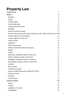 These notes include all weeks topics, such as the initial introduction to property law, the Torrens system, Native Title, Numerus Clausus, land and fixtures, leases, easements and mortgages, co-ownership, strata title, equity, indefeasibility and its exceptions, priorities, and briefly remedies,