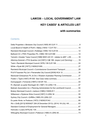 LAW336 Local Government Law Full case notes / summaries for the key cases in Local Government Law. Detailed case notes with all the important info.