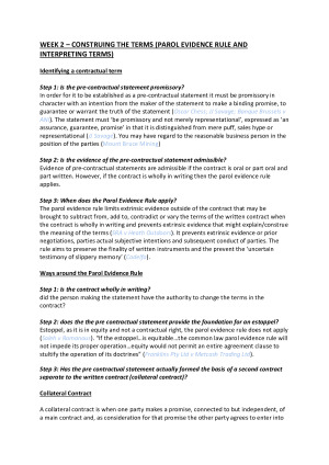 These summaries have a step-by-step layout, perfect for problem questions! They are a mixture of textbook notes (including relevant legislation and cases), specific quotes from cases that demonstrate higher knowledge, lecture slides and were also double checked to ensure accuracy at PASS sessions each week! Topics included: - Identifying Express Terms - Construing the Terms (Parol Evidence Rule and Interpreting Terms) - Gap Filling (Implied Terms) - Gap Filling (Frustration) - Termination - Measure of Damages - Misrepresentation at Common Law - Misrepresentation and Deceptive Conduct at Statute - Abuse of power I hope they serve you as well as they did me! :)