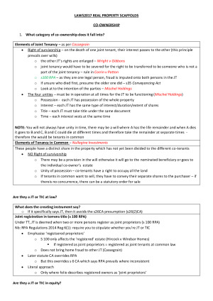Simple and easy to follow scaffolds to help you get through the final (80%) exam. Topics include: 3. Co-ownership 4. Easements and Profits a Prendre 5. Covenants over Freehold Land 6. Leases and Licences 7. Mortgages The first two topics are covered in the Mid Semester exam.