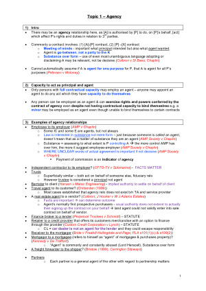 These notes are extremely comprehensive and useful for an exam. They include an exam script and also incorporate all of the prescribed readings. Includes the following topics: - Agency - Partnerships - Sale of Goods: Domestic - Sale of Goods: International - Negotiable Instruments - Guarantees - Insurance - Security Interests over Personal Property - Bankruptcy (or Personal Insolvency)