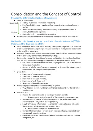Comprehensive notes based on the material from all 13 weeks of lectures, tutorials, and textbook readings. Examples provided where applicable and Accounting Standard references provided where appropriate. Topics include: - Consolidation and the Concept of Control - Principles of Consolidation and the Consolidation Process - Fair Value Adjustments and Tax Effects - Intra-group Transactions: Borrowing and Inventory - Intra-group Transactions: Non-Current Assets - Partly Owned Subsidiaries: Direct Non-Controlling Interest (NCI) - Compulsory Disclosures: Segment and Related Parties - Accounting for Associates and JVs: the Equity Method - Accounting for Joint Operations and Foreign Currency Translation - Financial Instruments and Hedge Accounting - Issues in Consolidations - The Standard Setting Process - Social and Environmental Accounting These notes helped me do really well and so would highly recommend them!!