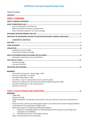HIGH DISTINCTION CRIMINAL AND CIVIL PROCEDURE NOTES: CLEAR, CONCISE, COMPREHENSIVE Comprehensive notes covering all topics in the Unit of Study Outline Notes include all relevant authorities and materials from prescribed readings and an accumulation of other HD notes. Includes a summary of all prescribed readings which may allow you to skip a few readings when the semester gets chaotic. Includes all topics covered in the course: Topic 1: OVERVIEW Topic 2: POLICE POWERS AND DISCRETION Topic 3: Bails and Appeals: Topic 4: Pre-Trial Process, the Decision to Prosecute and Mandatory Defence Disclosure Topic 5: Sentencing and Punishment Contents page is included which acts as a basic backbone to the course content, clarifying all relevant topics and authorities and how they fit into the course.