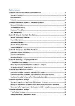 2020 HD BUSINESS STATISTICS 26134 (Complete & Final) Extremely detailed B Stats notes including thorough summaries and formulas for each topic. Perfect to print and use for the mid-sem and final exam (which are both open book!). Also helpful for the group assignment. Topics covered: Introduction & Descriptive Statistics I Descriptive Statistics II & Probability Theory Discrete Probability Distributions Continuous Probability Distribution Sampling and Sampling Distribution Point & Interval Estimates Hypothesis Testing I Hypothesis Testing II Hypothesis Testing III Regression Analysis I Regression Analysis II Final Revision Lecture