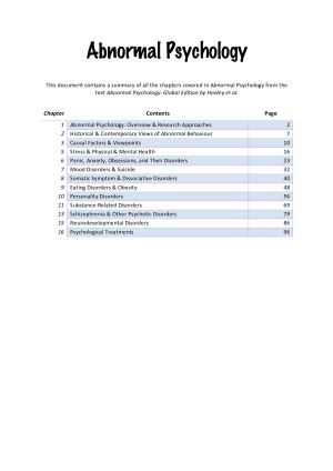 A summary of all the essential readings from weeks 1-12. Notes are detailed but concise so no need to read the text! DSM criteria are also included for all disorders covered. Week 1 - Distress & Mental Health Week 2 - Causal Factors Week 3 - Stress & Mental Health Week 4 - Anxiety Disorders Week 5 - Mood Disorders Week 6 - Psychological Treatments Week 7 - Dissociative Disorders Week 8 - Schizophrenia & Psychotic Disorders Week 9 - Disorders of Childhood & Adolescence Week 10 - Personality Disorders Week 11 - Eating Disorders & Substance-Related Disorders Week 12 - Revision