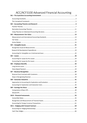 Comprehensive notes detailing each topic from the unit. These notes include tables, diagrams, and practice questions that I've created myself to help you learn the content and revise for the test and exam! Hopefully these notes will help you get a HD, like they did for me :) Topics: -The Australian Accounting Environment -Accounting Theories -Fair Value -Intangible Assets -Leases -Employee Benefits -Revenue Recognition -Extractive Industries -Earnings Per Share -Derivatives: Financial Instruments -Derivatives: Hedging