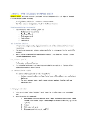 Notes cover all lectures and assessable content including: Intro to Australia’s financial system Intro to direct financing Intro to funds management Authorised deposit-taking institutions Shares and the share market The money markets The bonds market Foreign exchange and the FX market Interest rate risk and FRAs The futures market Interest rate swaps