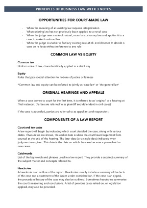 These notes are a combination of lecture material as well as readings (COVERS ALL CONTENT NEEDED FOR THE EXAM) - Curated into a succinct set of information that you need to know for the entire course - Grouped by weeks so that you can follow along with lectures. - Includes all examinable cases (facts, issue, decision, reason) at the end of the document TOPICS INCLUDE: - Introduction (week 1) - Australian legislatures, the legislation process, interpreting legislation (week 2) - Court-made law (week 3) - Contract law pt 1 -- Threshold issues and elements of contract formation (week 4) - Contract law pt 2 -- Terms of a contract (week 5) - Contract law pt 3 -- Performance and breach (week 6) - Contract law pt 4 -- Remedies for breach (week 7) - Contract law pt 5 -- Vitiating contracts (week 8) - Australian consumer law (week 9) - Tort law (week 10)