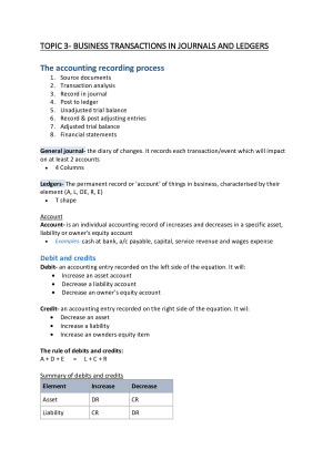 These comprehensive notes have been compiled from weekly content & textbook readings from weeks 1-10. They were my holy grail throughout the unit, particularly useful if you've never done accounting before!! I hope you're able to find some use in having these notes handy whilst you complete seminar questions, assignments and exams. Content covered includes: Topic 1- The accounting environment Topic 2- Classification and analysis of business transactions Topic 3- Business transactions in journals and ledgers Topic 4- Accounting for GST, PAYG and the BAS Topic 5- Trial Balance and balance day adjustments Topic 6- Preparation of financial statements Topic 7- Business planning & budgets Topic 8- Cost concepts for management decisions Topic 9- Interpretation and analysis of financial statements Topic 10- Contemporary accounting issues Please note any example, annotations or screenshots included in the notes I derived within Excel. Grade Achieved in Unit = 95 (HD)
