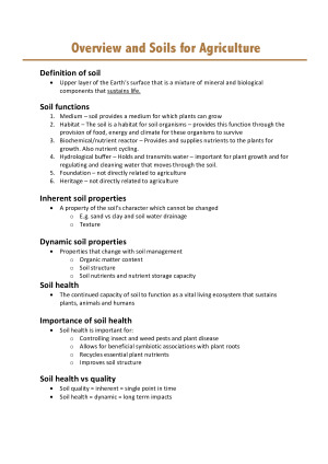 These notes include hand-drawn images and information about the following content; Overview and Soils for Agriculture - Definition of soil - Soil functions - Inherent soil properties - Dynamic soil properties - Soil health - Importance of soil health - Soil health vs quality - Key soil attributes - Soil profile - Eluvial and Illuvial horizon - Solum horizon - Profile forms - Texture contrast - Key components of soil - Soil organic matter - Soil Texture – importance - Describing soil texture - Soil Colour and Characteristic - Soil pH Soil Distribution - Distribution of soils based on latitude - Köppen Climate classification - What factors influence the distribution of soils globally? - What factors cause variation in soils locally? - The world’s biomes - Formation of soil structure - Köppen A Soils - Köppen B soils - Köppen C soils - Köppen D soils - Common problem with soils from dry zone - Agriculture on soils from the dry zone: Australia - Soil topography and region - Shrink-swell soil - What can be done to soils to improve their suitability for - agriculture? - How is soil structure and bulk density related to soil properties? Soil Genesis, Morphology and Classification - Factors which influence soil genesis/soil formation - Important periods for soil formation – Northern hemisphere - Important periods for soil formation – Southern hemisphere - Transported parent material - Soil forming factor – climate and temperature - Soil forming factor – Climate, moisture - Soil forming factor – Topography - Soil forming factor – Organic activity - Soil forming factor – time - eneral model for soil formation - Additions - Losses - Transformations - Translocations - Cheluviation - Leaching - Solonisation - Podsolization - Lessivage - Master horizons - Landform morphology - Australian Soil classification (ASC) - Australian Soil classification (ASC) – main - Australian Soil classification (ASC) – - Australian Soil classification (ASC) – No texture contrast - Vertosol Chemical Processes - Primary Minerals - Secondary minerals - Surface areas - Important chemical properties of the clay fraction of soil - Colloidal component of soil - The clay faction - Secondary Silicates - Clay surface and cations - Clay composition - Montmorillonite - Illite - Kaolinite - Preference for cations on exchange surface - Isomorphic substitution - Adsorption - Specifically-adsorbed ions vs non-specifically adsorbed electrolyte - ions - Cation exchange capacity (CEC) - Anion exchange capacity (AEC) - Lewis acid/base and metal complexes - Permanent (negative) charge surfaces - Reaction of cations with permanent charge surfaces - Cation exchange on minerals with low permanent charge - Adsorption to minerals of high permanent charge - Variable charge - Development of surface charge – Variable charge surfaces - Adsorption of cations to variable charge surfaces - Adsorption of anions to variable charge surface - Variable charge and organic matter - Adsorption to charged surface - Adsorption of cations to organic matter - Reactions of cations with organic matter - Adsorption of anions to organic matter - Anions in soil solution – phosphate - Anions in soil solution – Sulphate - Anions in soil solution – nitrate – NO3- - Anions in soil solution – Arsenate and dichromate - Cations in soil solution – K - K in soil solution – Illite – Vermiculite - Heavy metal anion adsorption - Cations in soil solution – Fe and Mn - Soil Physics - Examples of hydrological challenges - Stores and fluxes of water - Water balance – local example - Water balance equation - Important properties of precipitation - Units of precipitation - Rainfall measurement methods - Evaporation - Transpiration - Evapotranspiration - Why do we want to quantify evapotranspiration? - Potential evaporation - Pan evaporation - Measuring evapotranspiration - Estimation of evapotranspiration - Evapotranspiration and vegetation - Surface runoff - Surface runoff measurements - Estimating surface runoff by infiltration measurements - Place without soil - Imagining soil - Soil pores – capillaries - Potential energy - Soil water (potential) energy - Soil water energy – definition - Saturation - Field Capacity - Permanent wilting point - Soil water potential equation - Matric potential - Classification of soil water - Plant available water - Soil-Plant-Atmosphere Continuum (SPAC) - Darcy’s law - Hydraulic conductivity and water potential - Relationship between suction and hydraulic conductivity - Measuring saturated hydraulic conductivity in the field - Infiltration - Infiltration rate: Dry vs Wet soil - Green and Ampt infiltration equation - Macropore flow; Poiseuille’s equation - Infiltration excess runoff - Saturation excess runoff - Water repellence - Compaction Land degradation - What is land degradation? - Global status of soil degradation - Effects of soil erosion - Erosion: processes - Formation of aggregates: - Colloid structure - Pore size and its function - Importance of soil structure - Flocculation - Deflocculation - Deflocculation processes - Causes of soil structural decline - Consequences of soil structural decline - Universal soil loss equation - USLE - What soil properties affect erosion? - Sodic soils; Sodosol - Sodium Adsorption ratio (SAR) - Sodosol - Problems with sodic soils - Managing sodic soils to prevent erosion - Factors that contribute to erosion - Erosion and soil structural decline: management - Types of erosion - 3 forms of wind erosion - Wind erosion - Sheetwash and Rill Erosion - Gully Erosion - Tunnel erosion - Initiation of tunnel erosion - Streambank erosion, contributing factors - Mass movement/landslides: management - Overall erosion management considerations - Salinity definitions - Primary and secondary salinity - Process of salinization resulting from clearing of native trees from a - catchment - Effects of salinity on soil - Effects of salinity on plants - Recharge and discharge c