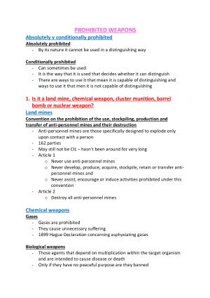 These exam notes are the perfect combination of lecture notes, readings and revision seminars. This unit is incredibly interesting but is notorious for a lack of structure - let these notes bring the structure for you! The topics covered are: sources of law, history of law and war, Just war - resorting to the use of force, conflict status: international vs non-international, When is a situation an armed conflict, individual battlefield status, Distinction, Military necessity, Unnecessary suffering, proportionality, prohibited weapons, targeting, conduct of hostilities, command responsibility, war crimes, perfidy, ruses, enforcement and cyber. These notes make great use of highlighting, formatting, colour and headings to make them as user friendly as possible. I took only these notes into the exam and got a distinction for that exam.