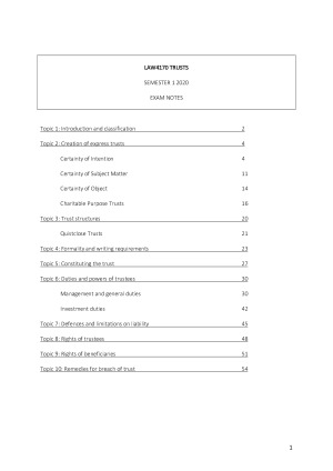 These full exam notes contain summaries of the law, case summaries and arguments that can be written out in the exam, including examples for applications to the fact. These notes were used by the writer to obtain a high distinction in all assessments for the unit. Topics covered include classification, creation of express trusts, trust structures, formality, constitution, duties and powers of trustees, defences, rights of trustees, rights of beneficiaries and remedies.