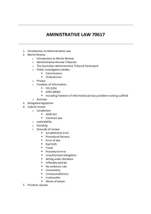 These are an amazing set of notes covering all topics in administrative law in great depth and detail. I constantly added and revised these notes throughout the semester, resulting in the perfect set of notes for you. Topic covered include: 1. Introduction to Admin Law; 2. Merits Review; - Administrative Review Tribunals - Public investigatory bodies - Privacy - Freedom of information - Archives 3. Delegated Legislation; 4. Judicial Review - jurisdiction - justiciability - standing - grounds of review 6. Privative Clauses I scored very well in the final exam due to these notes covering all essential topics and structured like an exam-style problem solving question. I hope you find my notes helpful and informative!