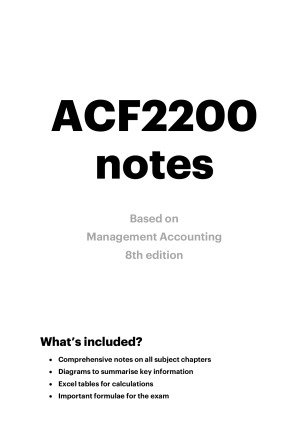 These notes were carefully crafted and used throughout the semester and the final exam to score 92% on the unit. Included in this document you will find: • Comprehensive notes on all chapters used in the subject (Management Accounting 8th edition, Langfield-Smith, et. al) • Diagrams to summarise key information • Excel tables for calculations (made from my own templates) • Important formulae for the exam (Table of Contents in preview document does not show the full table.) Please enjoy these notes and good luck for the unit. I hope you find it as enjoyable as I did!