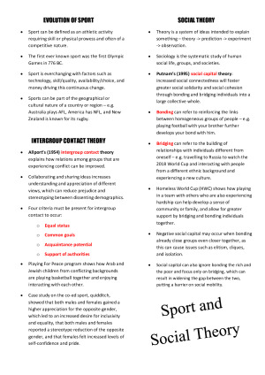 Sport & Society Notes. Covers core content of Autumn 2019 session including some examples unique from lectures/tutorials. Received a distinction with minimal study using these notes. Key words and concepts are outlined in red and content is separated with headings for the week's content as follows. Wk 2. Sport & Social Theory Wk 3. Sport & Its Impacts Wk 4. Youth Sports & Youth Sport Participation Wk 5. Sport, Racism & Diversity Wk 6. Sport, Gender Rights & Gender Equality Wk 7. Sport & LGBT Rights Wk 8. Disability & Adaptive Sports Wk 9. Technology & Drugs in Sport Wk 10. Sport & the Social Media Narrative