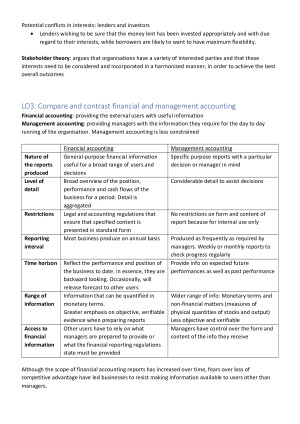 Comprehensive and detailed notes for the semester and exam study. These study notes are a combination of lecture notes, and textbook summaries, as well as additional readings. Learning objective for each topic is a heading and the relevant notes are carefully summarised under. Topic included: - Introduction to Accounting - Measuring and Reporting Financial Position - Measuring and Reporting Financial Performance - Recording Transactions - Accounting Systems and Internal Control - Regulatory Framework for Companies - Measuring and Reporting Cash Flows - Analysis and Interpretation of Financial Statements - Cost, Volume, Profit Analysis and Relevant Costing - Full Costing - Planning and Budgeting